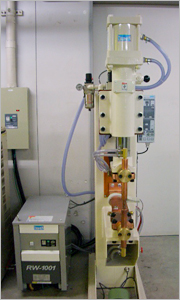 - 薄い鋼鈑を2枚重ね電極間にはさみ、加圧通電したときに発生する抵抗熱により点(スポット)溶接する機械。直流インバータ制御方式により、アルミ材の溶接が可能。